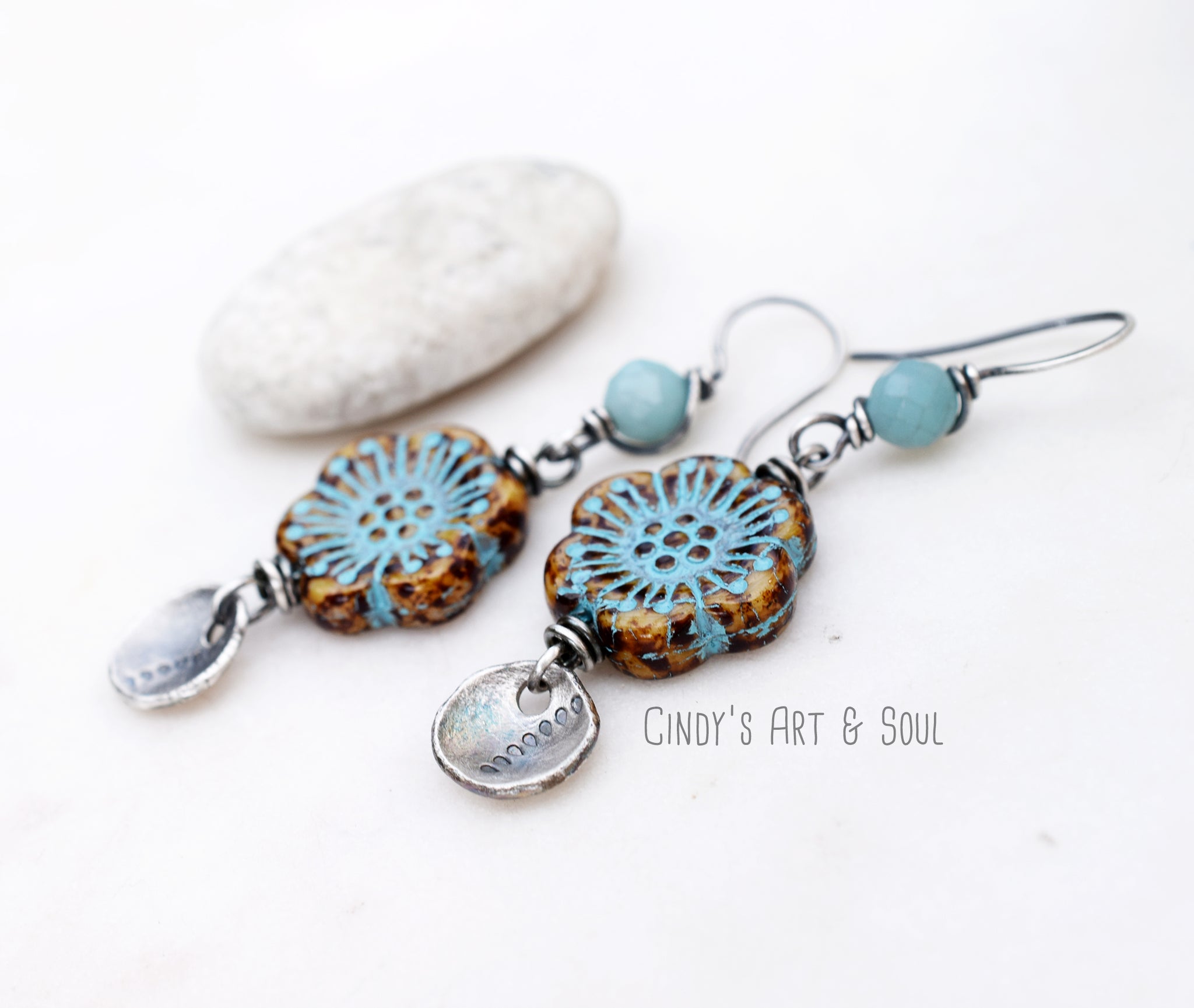 These earrings feature softly faceted natural fluorite stones, each with its own subtle variations in tone and texture. The hoops are handcrafted from fine silver, hammered for detail and shape, giving them an organic, earthy feel. Finished with an oxidized patina that’s been polished by hand, they carry both rustic charm and timeless elegance.