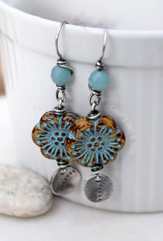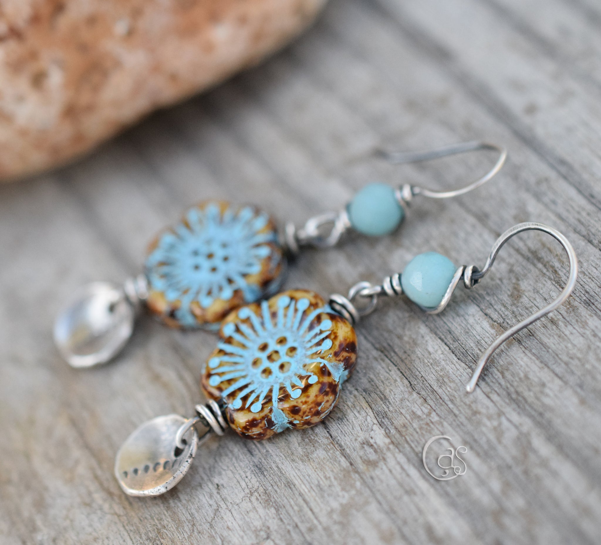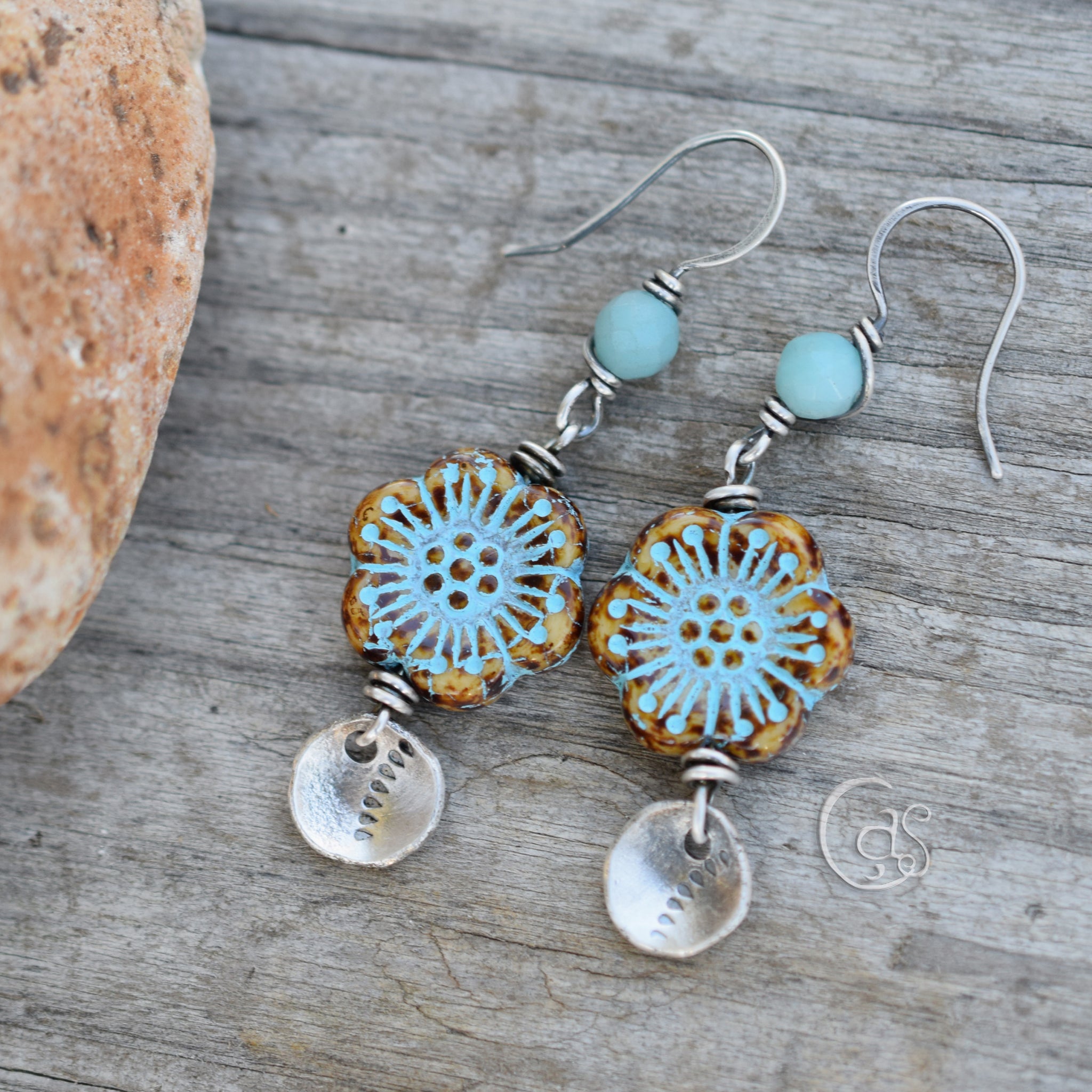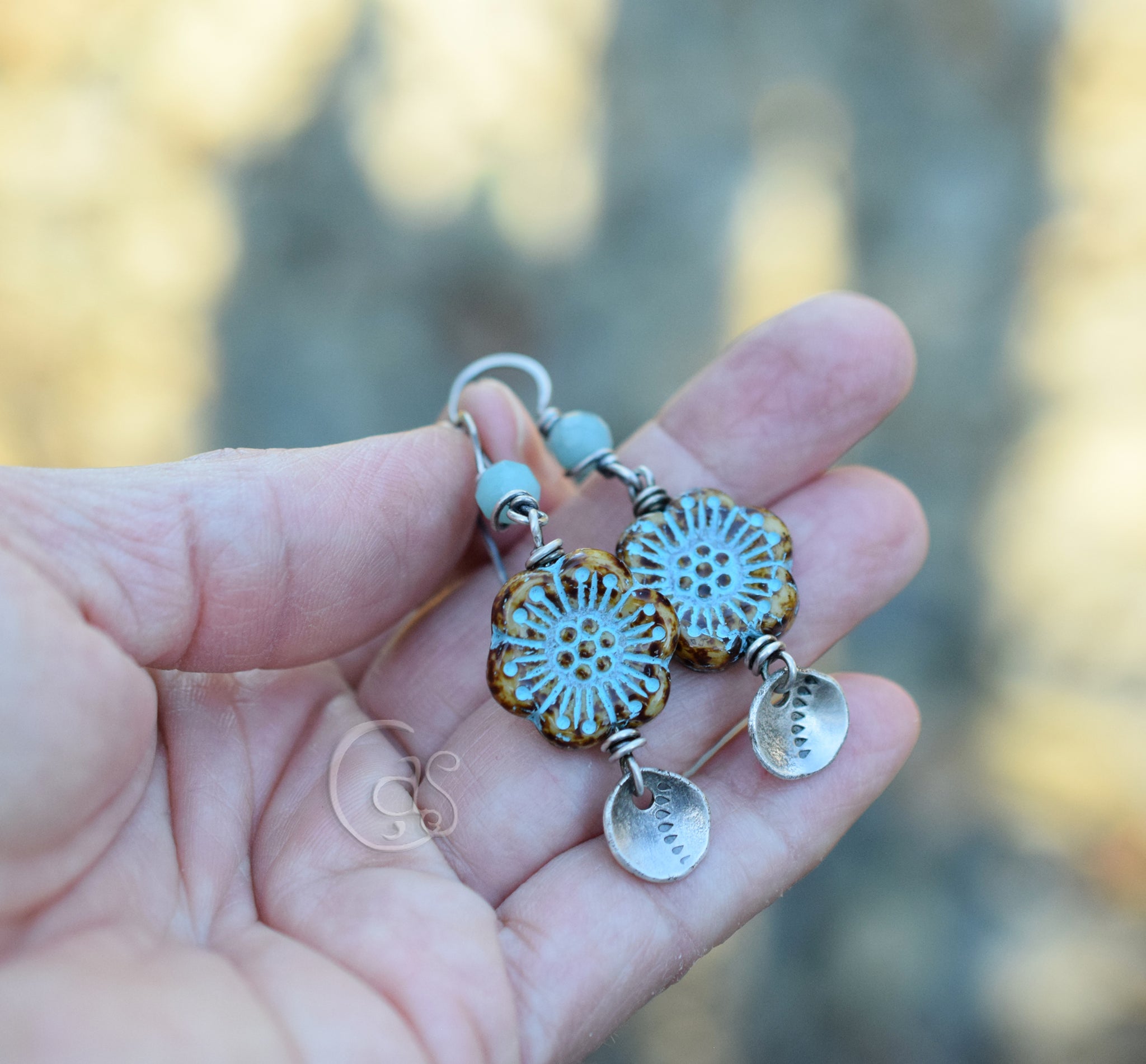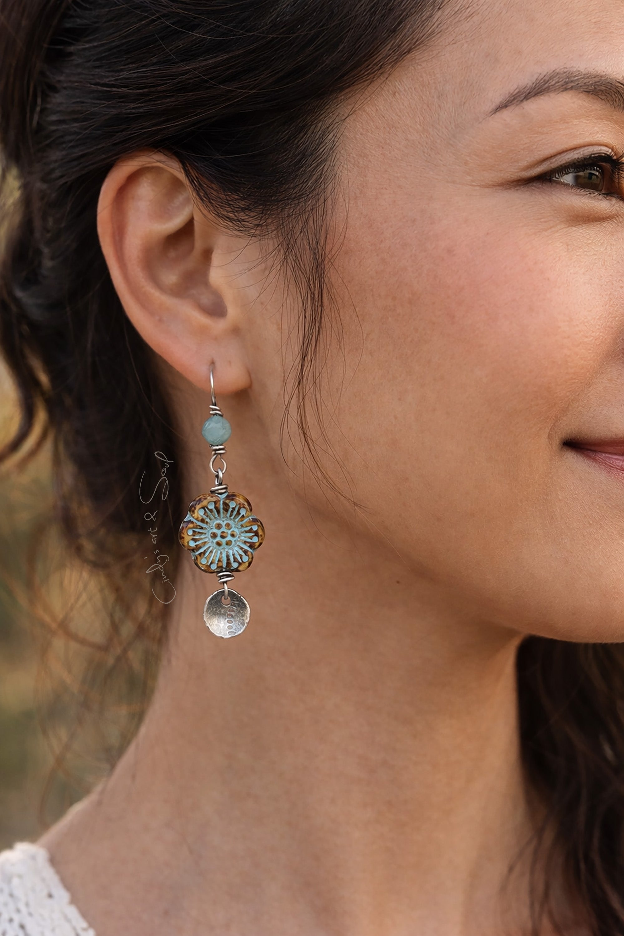 Bronze-wrapped Czech glass leaves shimmer in aqua green tones, evoking light filtering through the forest. Above the hoops, faceted aqua fluorite and green aventurine gemstones add layers of translucence and grounding energy.