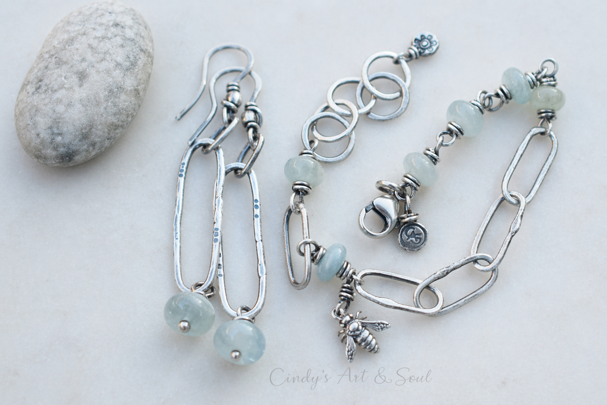 Each aquamarine bead is wrapped by hand in fine silver wire and linked into a hand forged bracelet design with an artisan feel and lasting quality. At the center hangs a detailed double sided sterling silver bee charm, adding movement and symbolic meaning to the piece.